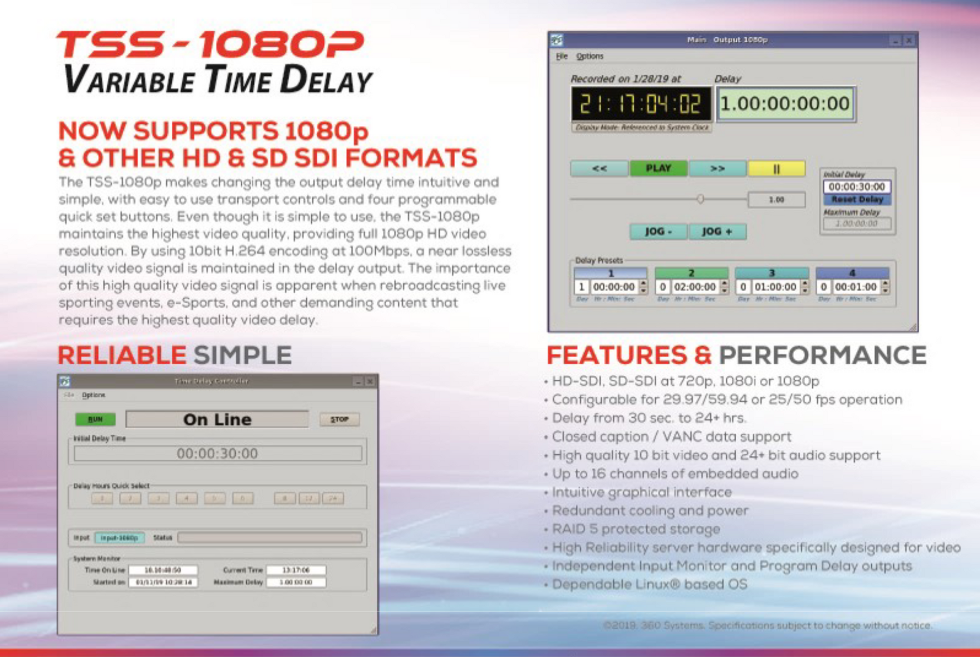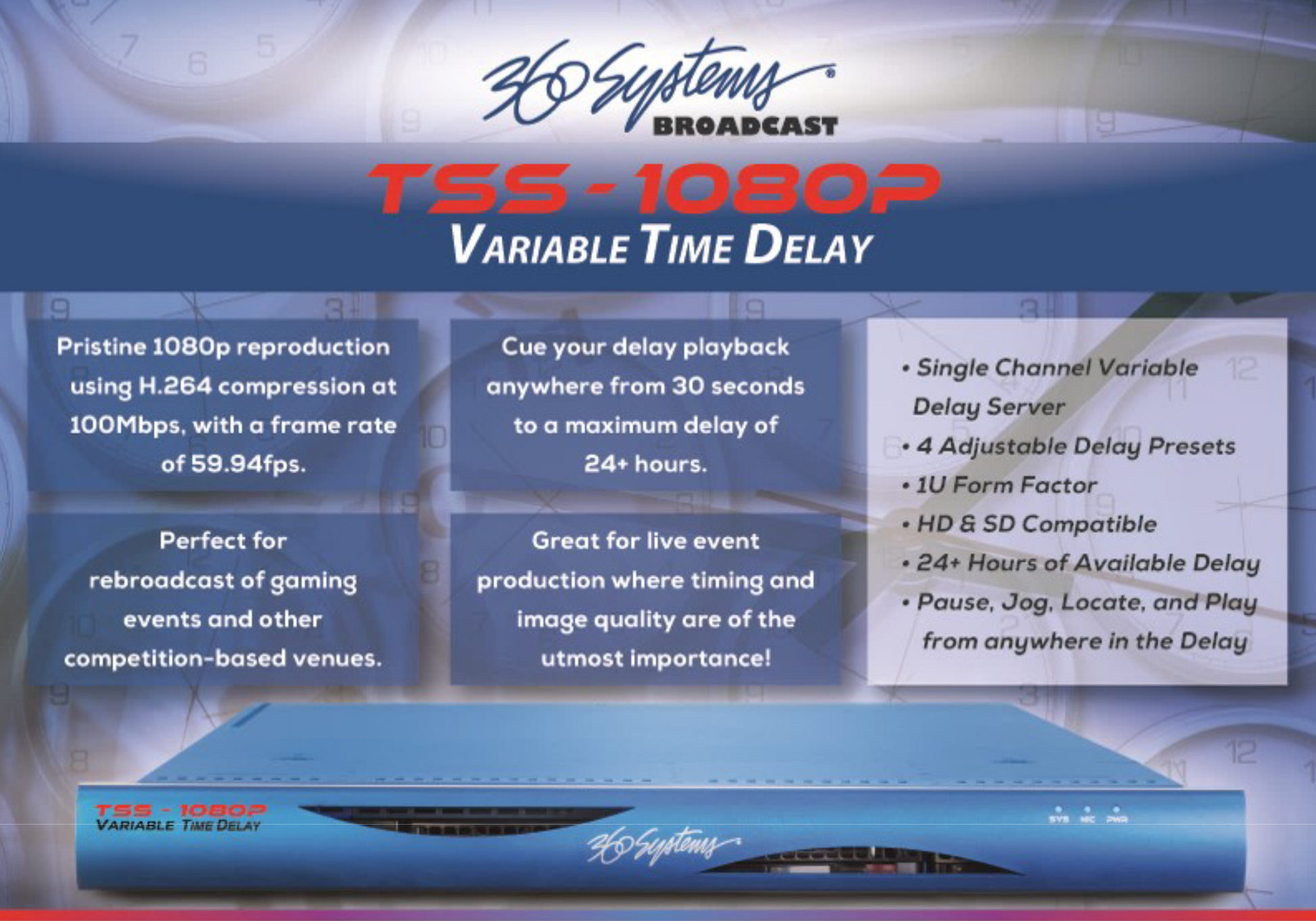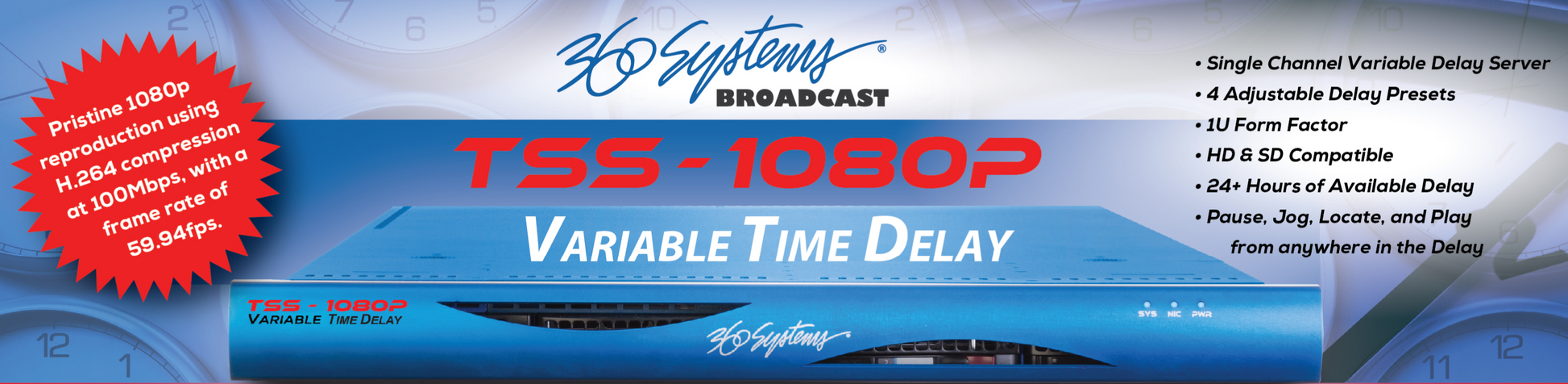 The 360 Systems NEW TSS-1080p Variable Time Delay system—a game-changer in the world of broadcast technology. This state-of-the-art device offers unprecedented control over your 1080p video streams, allowing you to delay them from 30 seconds to a whopping 24 hours with frame-accurate precision