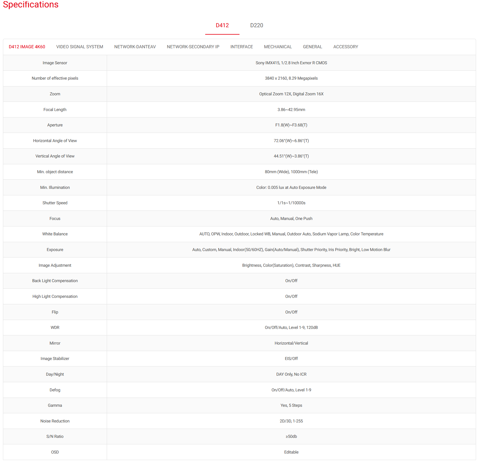 The Dante AV Ultra camera provides high quality color image up to 4K60 / Full HD, with quiet and smooth Pan, Tilt and Zoom capability. It is a great video device that is fully compatible with existing Dante system for Dante audio devices to work with.