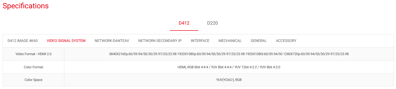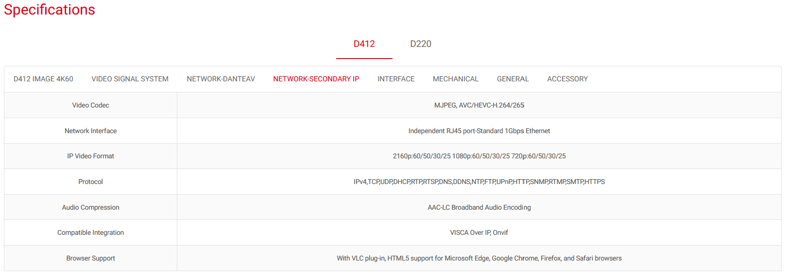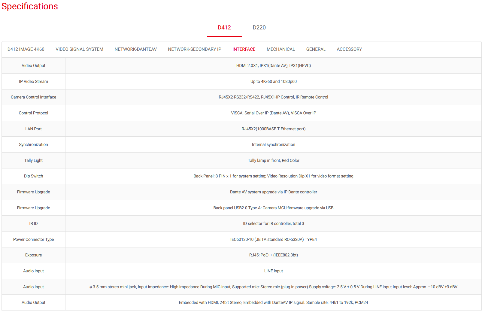The D412/D220 Dante AV Ultra PTZ camera includes two RJ-45 1000BASE-T ports can be used to transport video over a Gigabit Ethernet network. Ports 1 for Dante network primary connection and Port 2 can be used to daisy-chain other endpoints. Port 1 is also capable of receiving power via POE++.