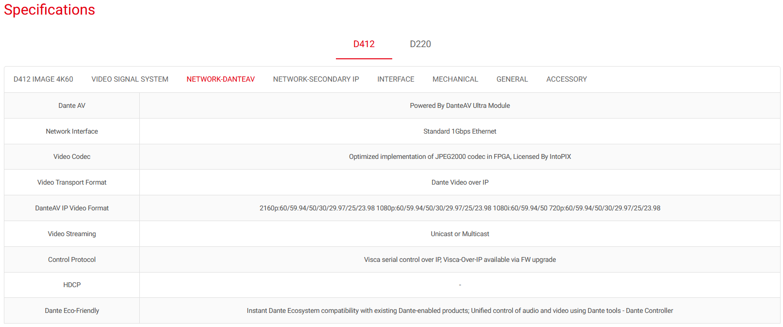 Point to Multipoint and Point to Point Distribution – supports both unicast and multicast video distribution. Paired with Dante AV Ultra decoder, using familiar Dante Controller software, the decoder can quickly and easily switch between multiple DanteAV camera endpoints on the network, with no need for breakouts or matrix switches to unicast or multicast display the video on any number of screens and video router system to use.