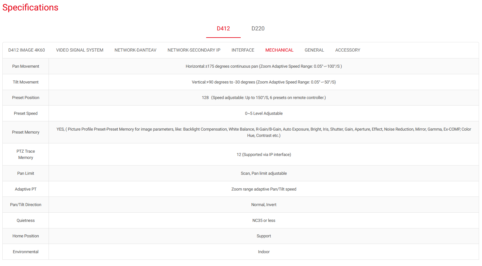 Extremely quiet and smooth operation for Pan/Tilt movements combined with enhanced adaptive, variable, and super slow speed control provides accurate and effective operation experiences. Picture Profile Preset- Image parameter setting restore with presets and quick access operation.