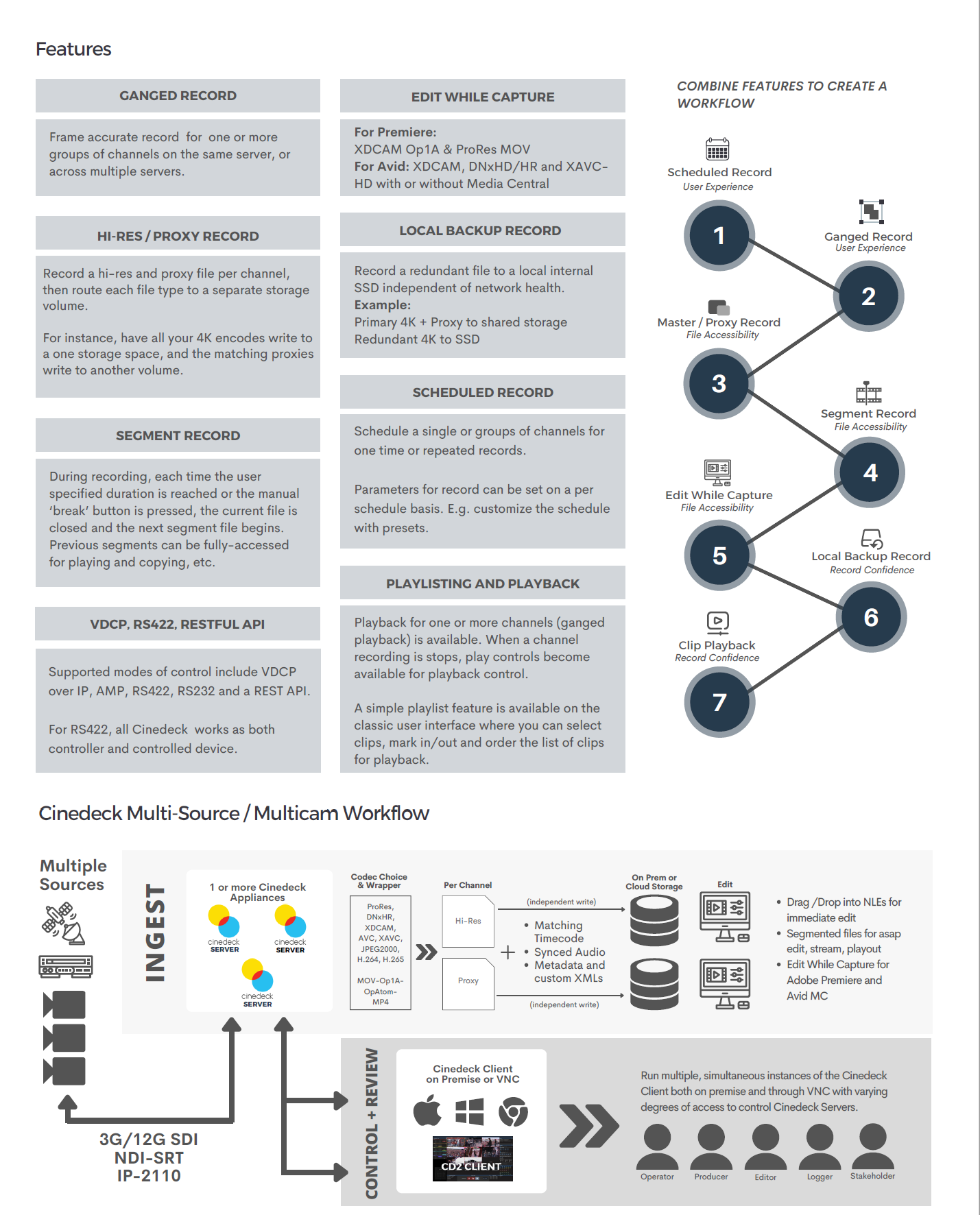 Cinedeck deliver unrivaled speed and versatility. Our recorders support a wide variety or codecs, wrappers, formats, and resolutions. Control all the settings with the Cinedeck 2.0 Multi-Channel Control app for Mac and PC. Record your media directly to your networked storage or to a standard 2.5″ SSD. From JPEG2000 archive formats to XAVC, ProRes and DNxHR 4K Multicam, Cinedeck recorders cover a wide range of ever-evolving workflows.