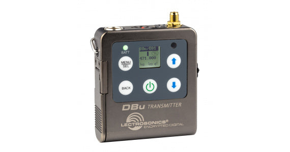 The DBu transmitter is a 4th generation design with specially developed, high-efficiency digital circuitry for extended operating time on two AA batteries. The transmitter can tune in coarse or fine steps across the UHF television band from 470 to 608 MHz (470-614 MHz for export versions), with a selectable output power of 25 or 50 mW. The pure digital architecture enables AES 256-CTR encryption for high-level security applications. The top panel contains the antenna jack, audio input level LEDs, the programmable function switch and the audio input jack. The LEDs provide red/green indications of the audio level from -20 dB to the onset of limiting to enable accurate input gain adjustment. The programmable switch can be configured as a mute switch, a power on/off switch, talkback, or be bypassed. Studio quality audio performance is assured by high quality components in the preamp, wide range input gain adjustment and DSP-controlled limiting. Input connections and settings are included for any lavaliere microphone, dynamic microphones and line level inputs. Input gain is adjustable over a 44 dB range in 1 dB steps to allow an exact match to the input signal level, maximizing the dynamic range and signal to noise ratio.