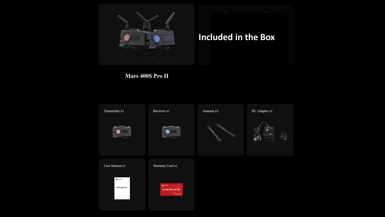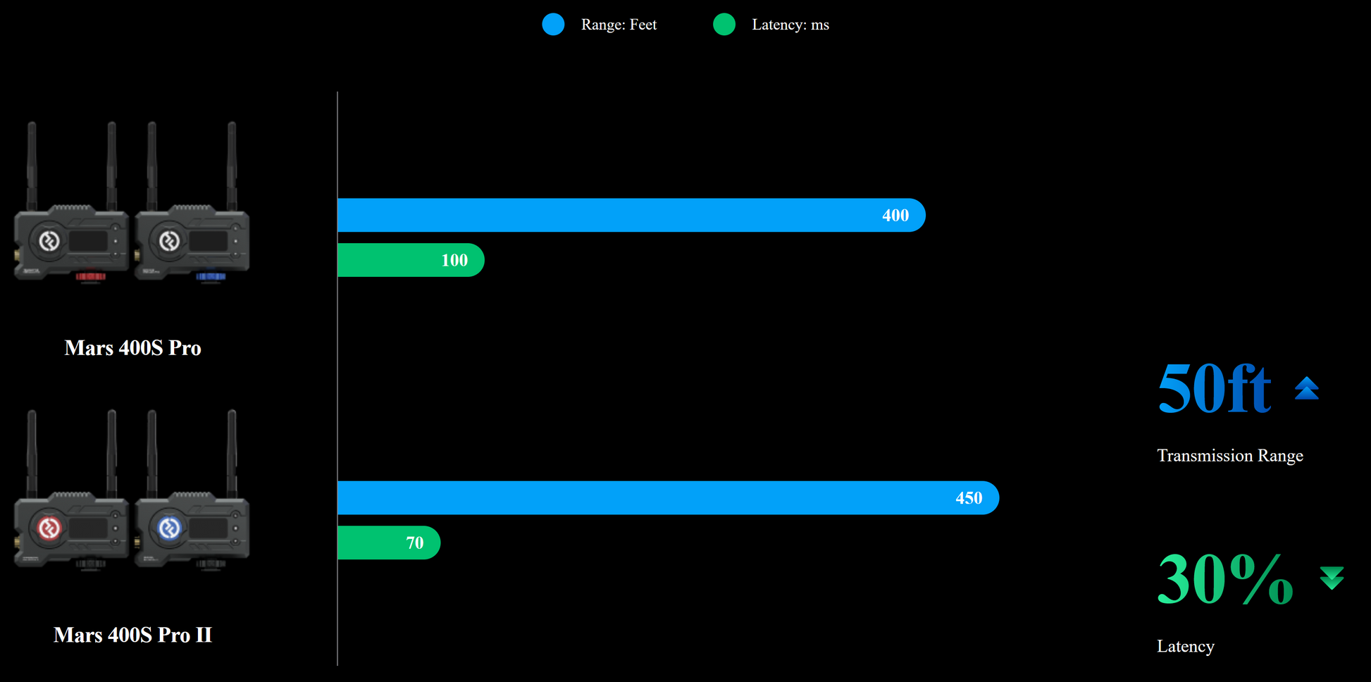 Mars 400S Pro II is a powerful video transmission device with remarkable features. It offers a transmission range of up to 450ft (150m) and achieves a low latency of just 70ms. Additionally, Mars 400S Pro II is equipped with SDI+HDMI dual interfaces, supports multi-receiver setups, and allows monitoring through the HollyView App.