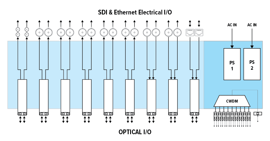 Gigabit Extensions: Supports up to 9 1GbE optical extensions, handling SDI and LAN signals in one frame.