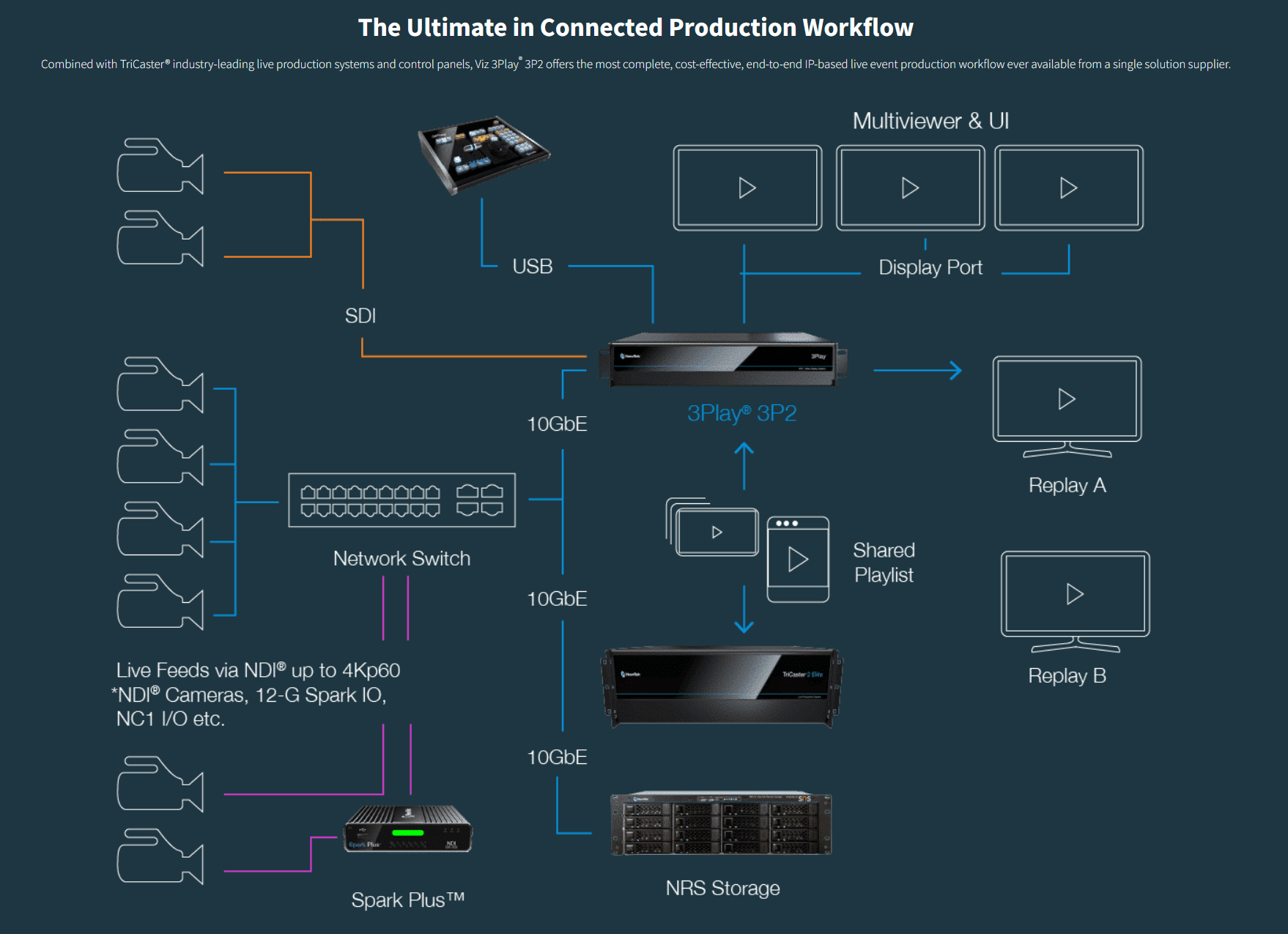 Why Viz 3Play® 3P2? A complete, cost-effective, IP based live event production and replay system that takes advantage of software-driven video technology and modern networking to provide users with comprehensive capabilities, increased scalability and flexibility.
