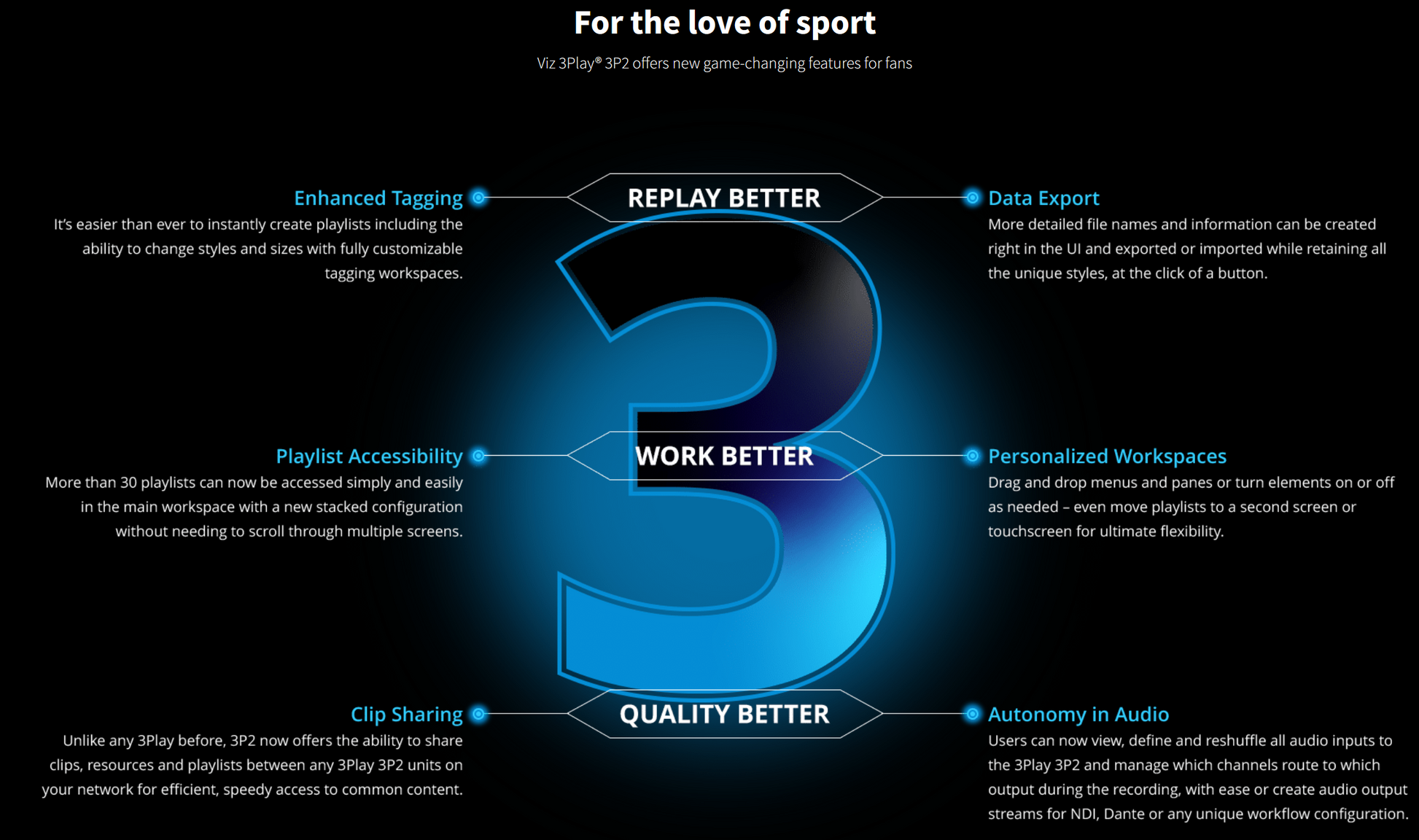 Viz 3Play 3P2 is an unmatched sports replay solution; sports broadcasters never miss an angle or unforgettable sporting moment with unparalleled connectivity and efficiency across the whole production workflow.