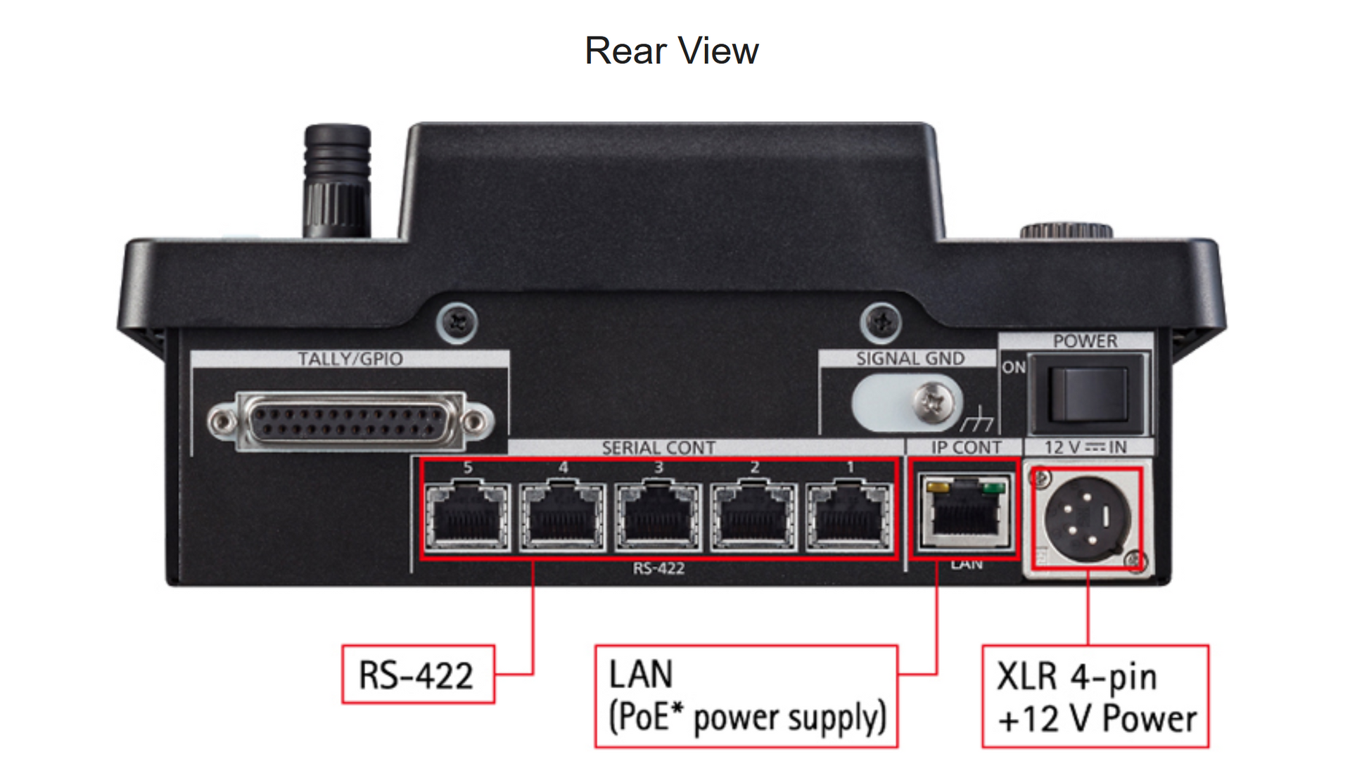 | SERIAL CONT (RJ-45) | RS‑422 (control signals for remote cameras), TALLY OUT Connecting cable: Straight cable (category 5e), max. 1000 m (3280 ft) TALLY OUT: Open collector output (negative logic) Maximum voltage resistance DC 24 V, Maximum current 50 mA |