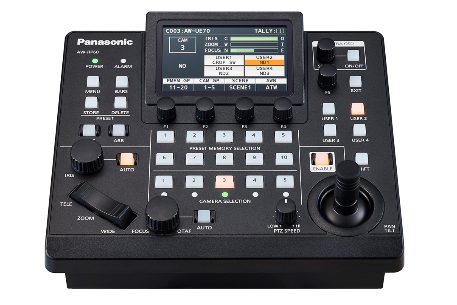 The AW-RP60GJ is a hardware-based controller designed specifically for Panasonic PRO PTZ remote cameras. This compact controller boasts an enhanced joystick that ensures seamless and precise camera control for up to 200 robotic cameras. Additionally, it offers effortless management of up to 100 camera presets, making it a versatile and user-friendly tool.