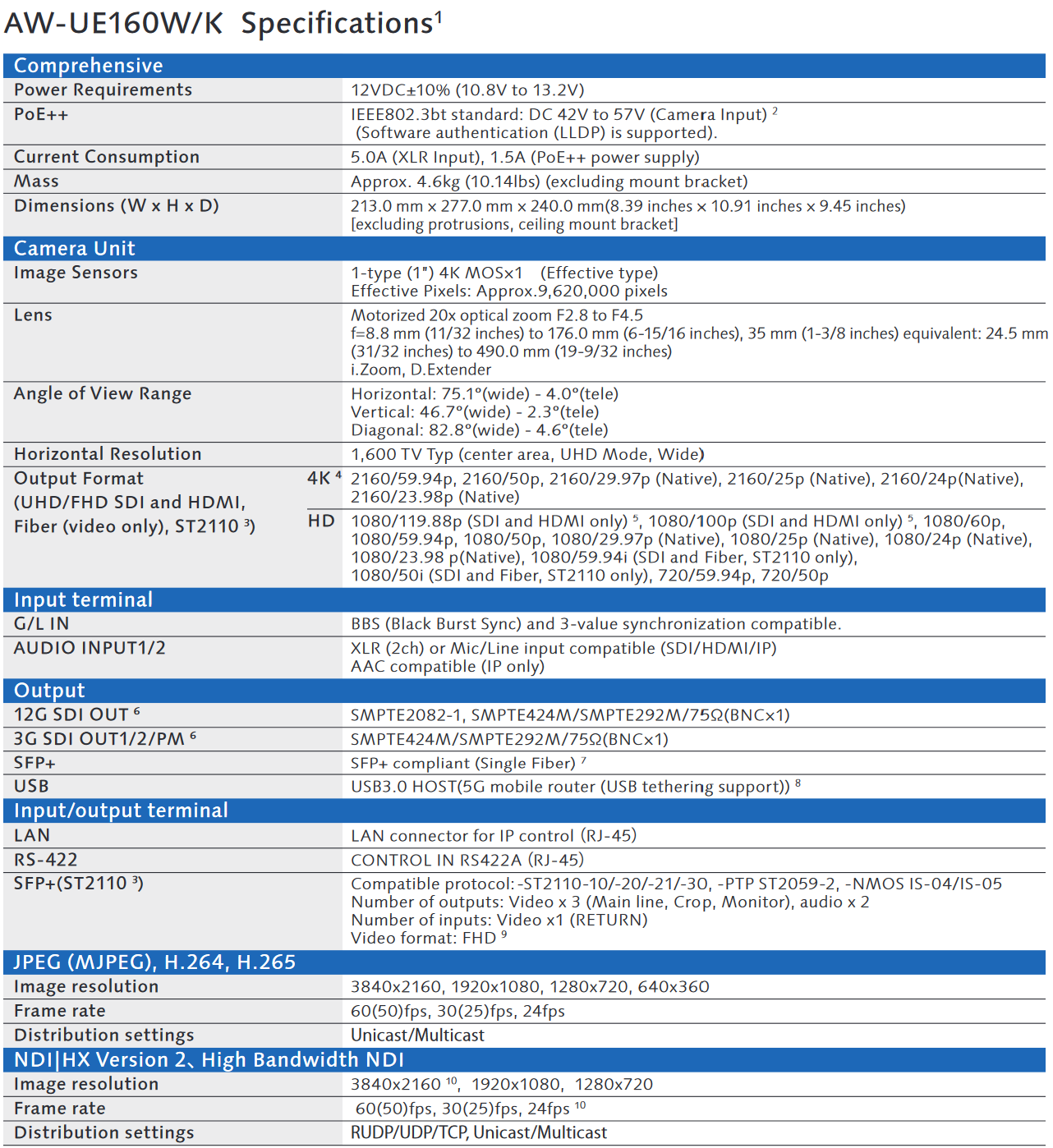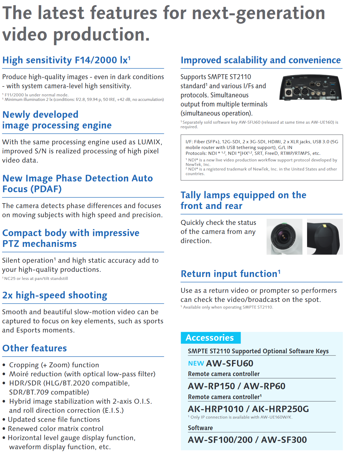 | NDI | AW-UE160:High Bandwidth NDI, NDI|HX Ver.2 included as standard |
