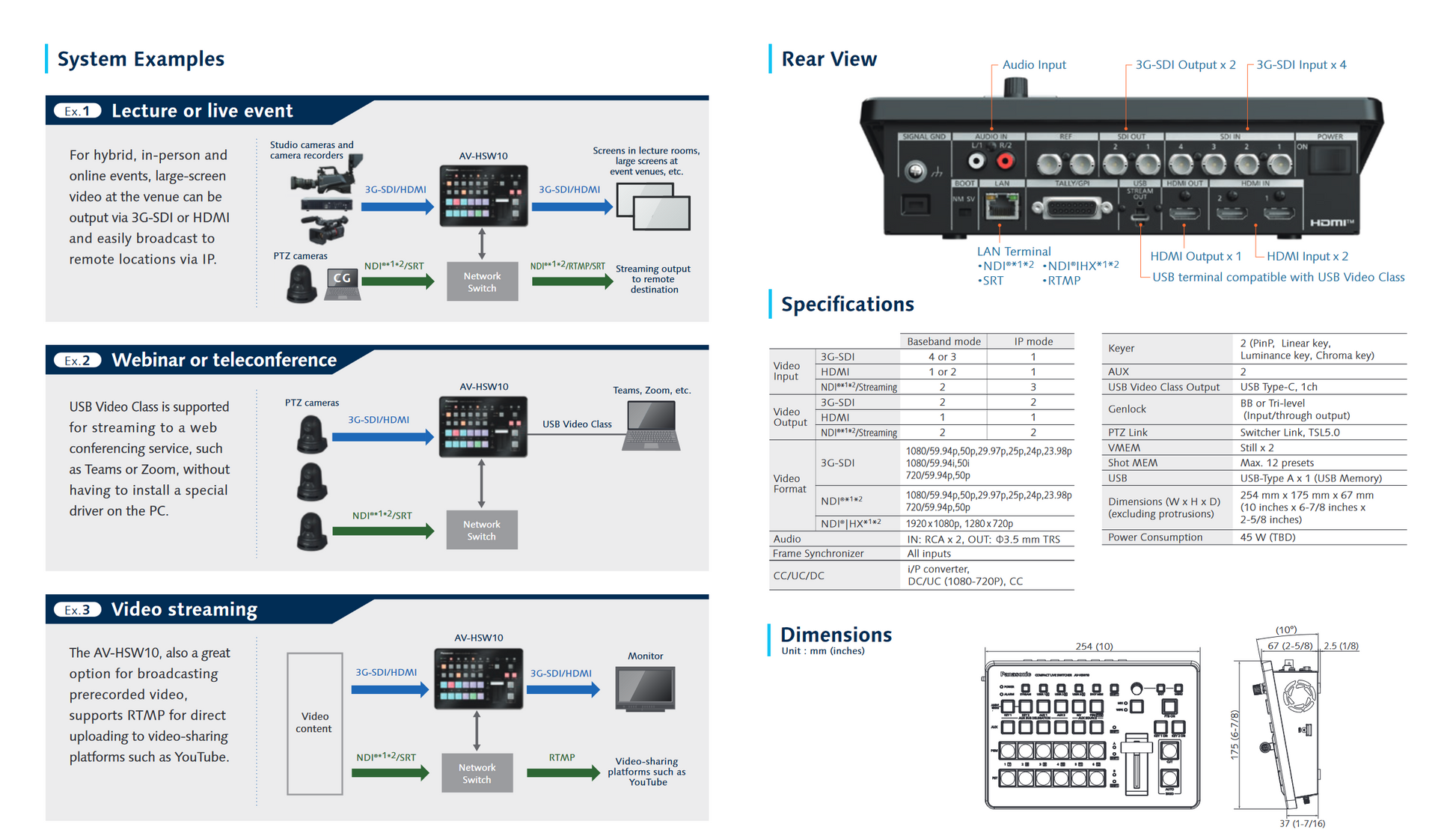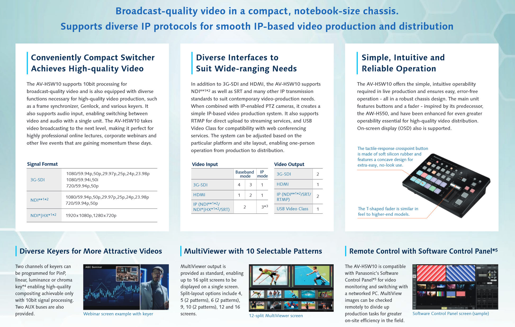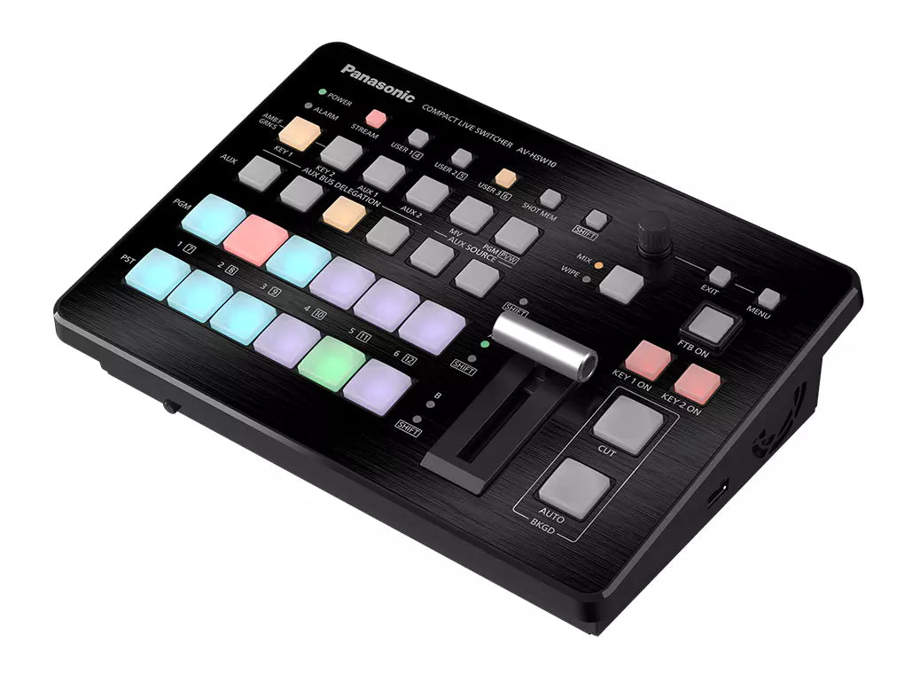 The AV-HSW10 is specifically crafted to cater to the needs of live events, be it high-flex university courses, smaller corporate events, or webinars that require seamless switching between multiple cameras and direct streaming from the switcher. Its compact, notebook-sized design is ideal for production crews operating in more intimate venues. With its user-friendly buttons, T-shaped fader, and intuitive on-screen display, it ensures a hassle-free experience. Moreover, it guarantees top-notch broadcast image quality and exceptional performance, thanks to its advanced 10bit processing. Additionally, it offers extensive connectivity options and supports various I/O's and streaming protocols, including SDI, HDMI, NDI®, SRT, and RTMP.