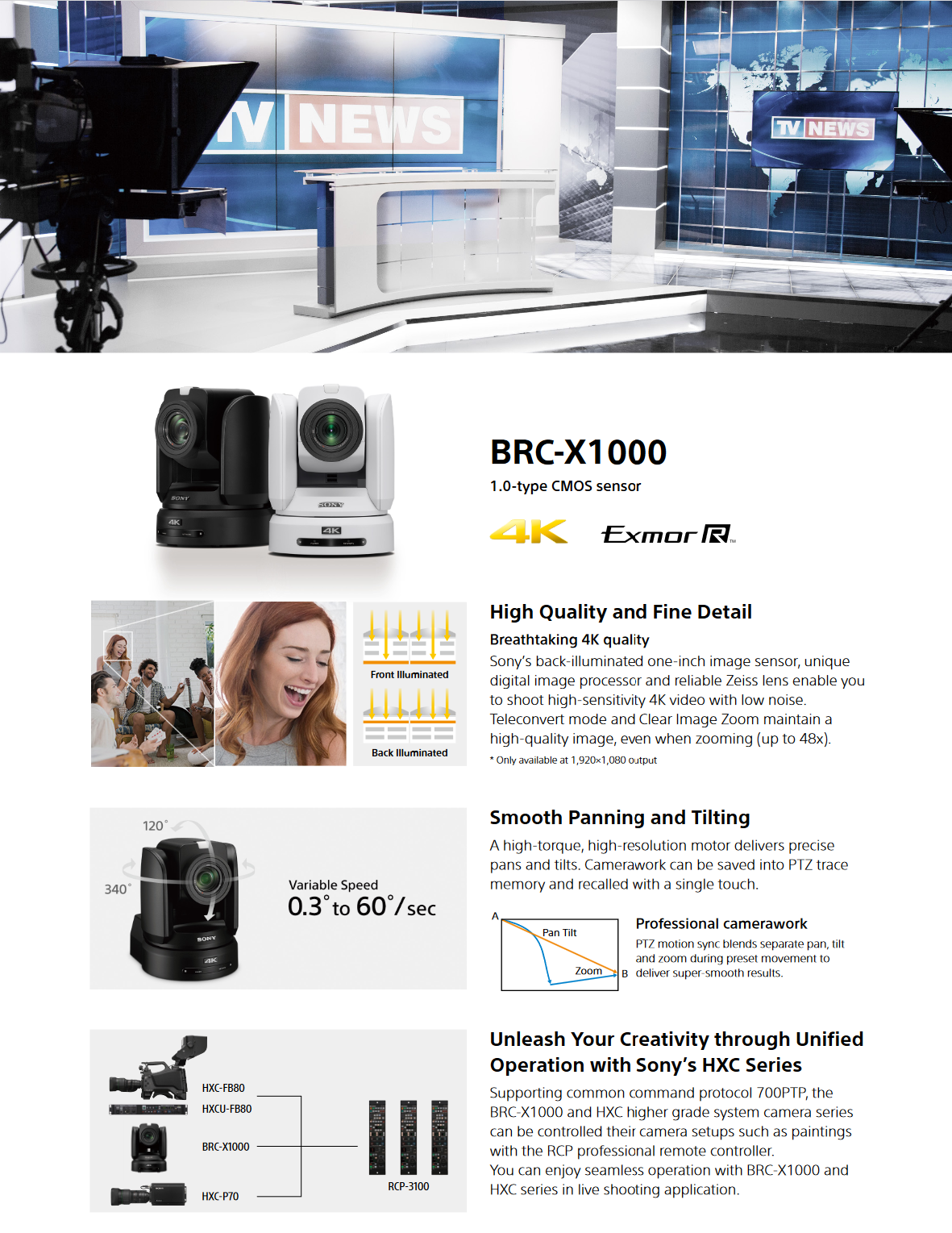 The BRC-X1000 is Sony's first 4K remote camera, combining uncompromising broadcast picture quality and smooth, silent PTZ operation with the flexibility of 3G-SDI and HDMI connections.